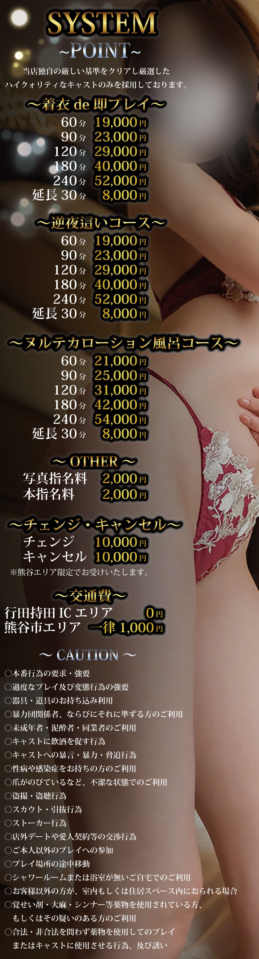>プレイ途中に以下の禁止事項に違反された場合、即時サービスを中断し女性は退出します。
